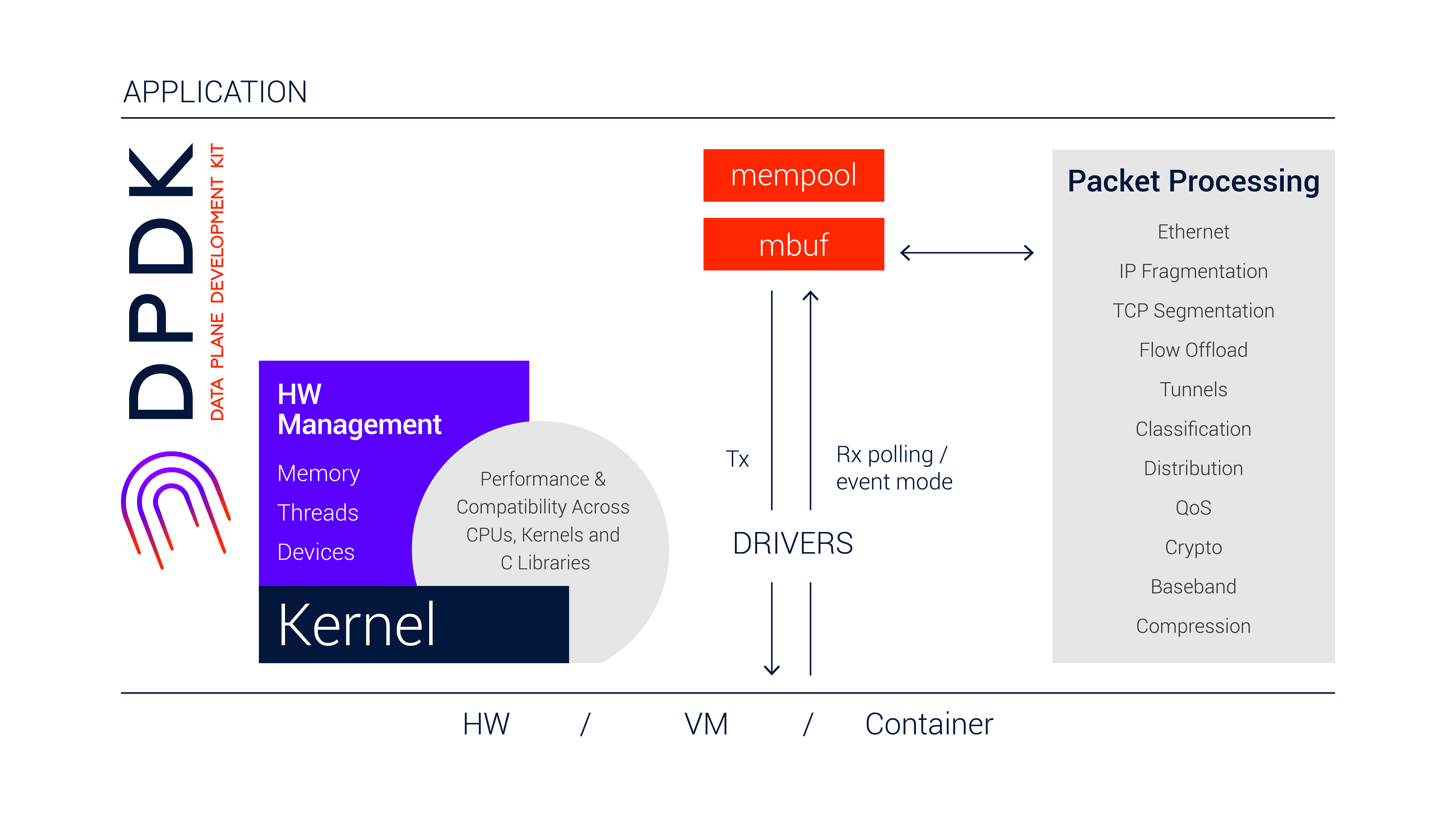 다양한 하드웨어 디바이스에 대한 추상화 및 드라이버를 제공하는 계층입니다. Bus Drivers는 PCI, VDEV (Virtual Device) 등을 지원하며, **Poll Mode Drivers (PMDs)**는 인터럽트 방식 대신 폴링 방식을 사용하여 패킷 수신 오버헤드를 줄이고 높은 처리량을 제공합니다. 이더넷 (ethdev: Intel, Mellanox, virtio 등), 암호화 (cryptodev: AESNI, QAT, OpenSSL), 압축 (compressdev: zlib, QAT), 이벤트 처리 (eventdev: hardware/software event scheduler), 머신러닝 추론 (mldev), 그리고 Rawdev, Regex, DMA 등의 다양한 장치를 지원합니다. 관련 디렉토리는 /drivers/, /lib/ethdev, /lib/cryptodev 등이 있습니다.