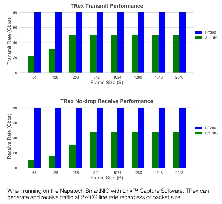 Optimized for lossless transmit and receive, the solution demonstrates substantial performance advantages for TRex compared to a standard Network Interface Card (NIC):