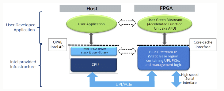 Intel has developed a framework SDK – the Open Programmable Acceleration Engine (OPAE) – that operates with terms like blue and green bitstreams, using the colors to describe the internals of the Intel FPGA. The blue bitstreams are FPGA functional blocks delivered by Intel to make the card work. It contains IO logic for all the surrounding peripherals like PCI, SDRAM, and QSFP+. The green bitstream is where the user code (AFU) is located. The blue bitstream abstracts the IO via standardized APIs enabling the green bitstream to be easily ported to new blue bitstreams on other HW platforms.